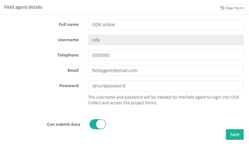 To fill out forms online supported by Enketo, the field agents (enumerators) need to log in using their credentials (username and password). Here we do a quick explanation on how to register a new field agent, that subsequently will login to Enketo to submit data from a browser.